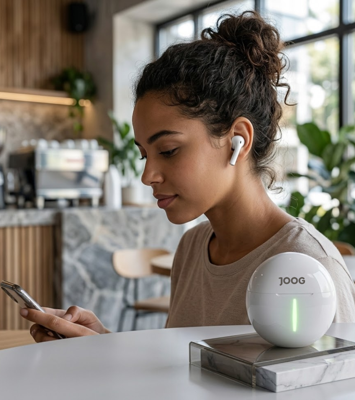 Com acabamento branco elegante, o Joog Air 1 Pro combina estilo e funcionalidade em um único produto.